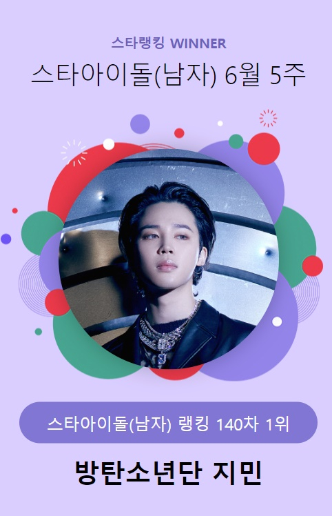Jimin ficou em primeiro lugar com 92.726 votos na 5ª semana de junho (140ª) votação do ranking masculino do Star Idol realizada das 15h01 do dia 27 de junho às 15h00 do dia 4.
