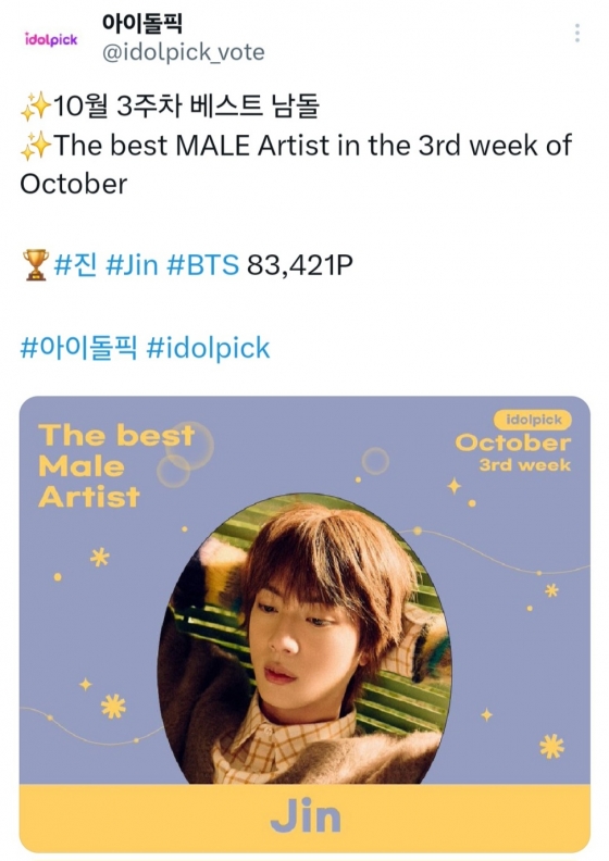Jin recebeu anteriormente o maior número de votos na enquete semanal e foi homenageado com a honra de ser selecionado como o ‘Melhor Ídolo de Agosto’ e ‘Melhor Ídolo de Setembro’ por dois meses consecutivos.