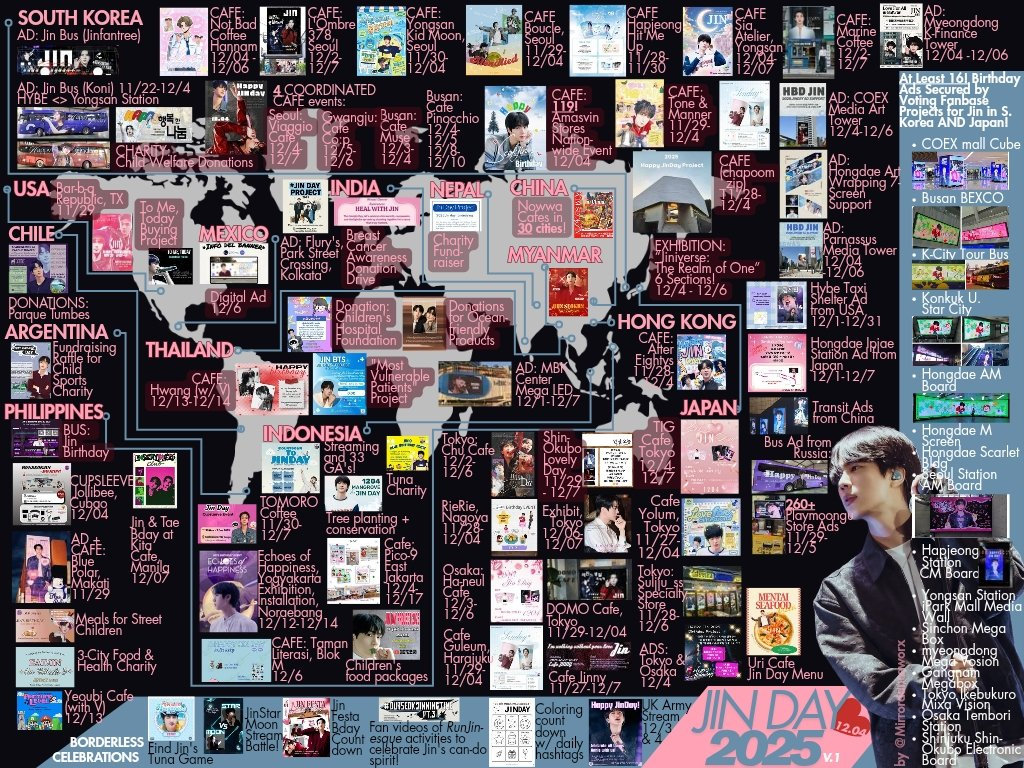 Fãs ao redor do mundo pintaram dezembro de rosa para celebrar o aniversário de Jin, do BTS. Da Coreia ao Japão, Índia, Mianmar e Argentina, inúmeros fãs criaram uma atmosfera festiva especial, celebrando o aniversário de Jin de forma significativa com anúncios, eventos e doações.