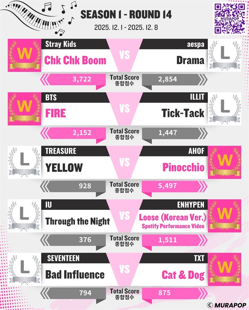 Enquanto isso, os resultados do Murapop são calculados somando as visualizações oficiais dos videoclipes no YouTube e os votos globais dos fãs dentro do aplicativo durante o período da partida para determinar a pontuação geral. As porcentagens de votos são divulgadas com base nos indicadores relativos a cada partida, e visualizações, votos e pontuação geral servem como indicadores objetivos para comparar as classificações entre as partidas, e não apenas vitórias e derrotas.