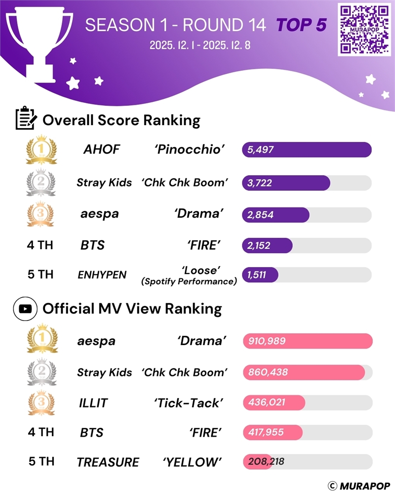 Recentemente, a plataforma global de competição de K-pop MURAPOP revelou os resultados da disputa entre os videoclipes das temporadas 1 a 14. "FIRE", do BTS, competiu contra "Tick-Tack", do ILLIT. Como resultado, o BTS venceu com 417.955 visualizações, 87% dos votos e uma pontuação total de 2.152 pontos.