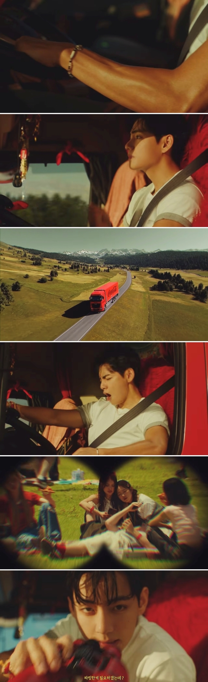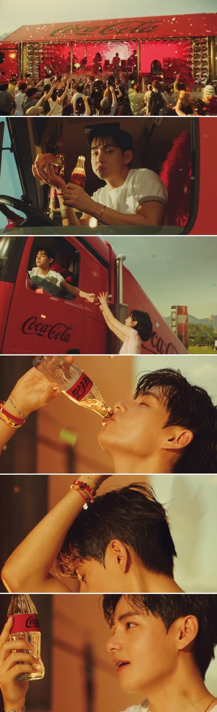 V toma um gole de Coca-Cola refrescante e olha alegremente para as pessoas. Quando uma garota olha para a Coca-Cola, ele lhe entrega a Coca-Cola que estava segurando, deixando uma forte impressão. Na cena final, V olha para a câmera enquanto bebe Coca-Cola Zero, transmitindo uma forte sensação de frescor, e o comercial termina.