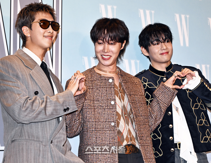 Os membros do BTS RM, J-Hope e V posam para uma foto no evento beneficente "W Korea 20th Breast Cancer Awareness Campaign", realizado no Four Seasons Hotel em Dangju-dong, Seul, na tarde do dia 15.
