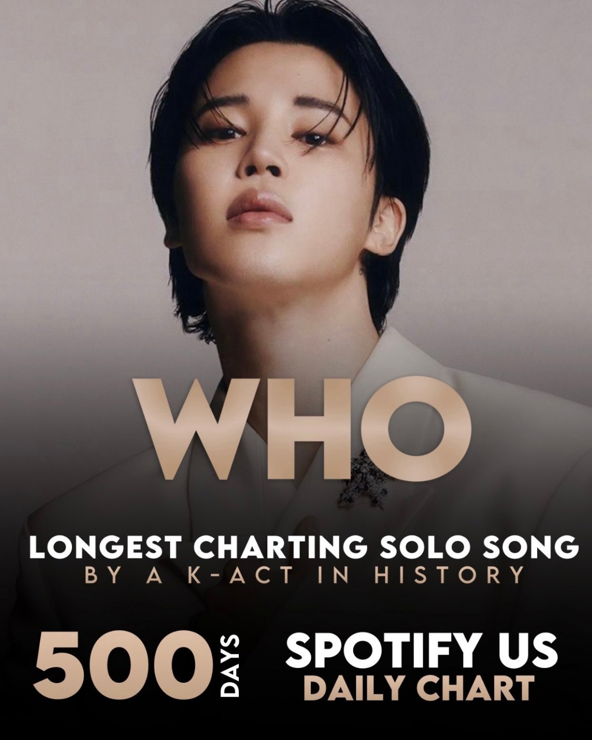 Enquanto isso, Jimin está demonstrando um desempenho inigualável como o cantor de K-pop de maior sucesso nas paradas dos EUA, que possuem o maior número de usuários, com 'Who' entrando com sucesso no top 100 das 'Músicas Mais Reproduzidas de Todos os Tempos no Spotify dos EUA' pela primeira vez na história do K-pop, atualmente na 82ª posição.